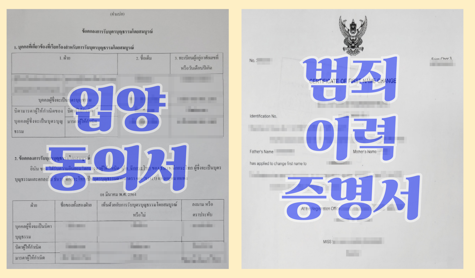 (결혼증명서, 출생증명서, 개명증명서, 이혼판결문, 가족관계증명서, 주민등록등본, 무범죄증명서, 졸업증명서, 성적증명서, 친양자 입양 서류 등)